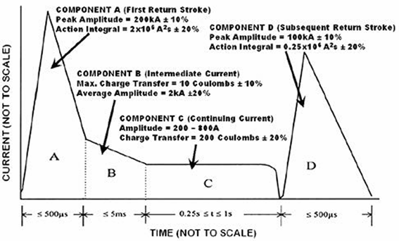 波形B | 平均电流幅值2 kA ± 10%,最大电荷量小于10库仑± 10%,持续时间不超过5 ms。此阶段电流必须是单向的方波电流,或用指数或线性衰减电流代替。 |