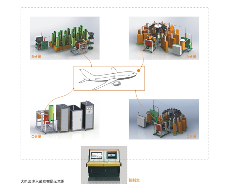 本套雷电直接效应测试系统包括高电压附着点分区试验系统和大电流物理损毁试验系统。高电压附着点分区试验系统可模拟测试飞机等设备在遭受雷击时,在飞机表面不同区域可能被雷电袭击的概率,找到容易被雷电袭击的附着点。大电流物理损毁试验系统用来模拟飞机在遭受雷击时,其附着点遭受大电流时产生的高温、强电动力对飞机结构等部分的破坏效应。
