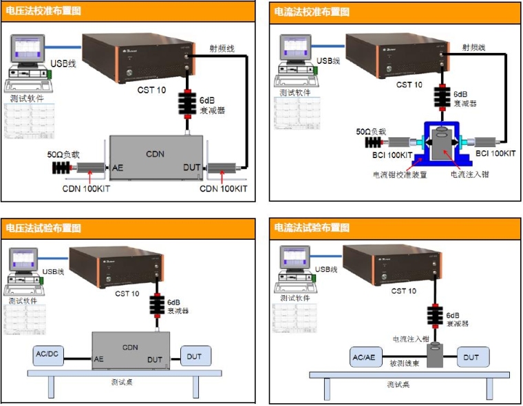 射频传导抗扰度测试系统CST系列采用一体化设计,内置集成信号发生器、RF功率放大器及RF功率表。各设备可以独立使用,可选外置功率放大器。内部的宽带功放(Class A)驱动耦合/去耦网络(CDN)、电磁钳(EM-钳)以及电流钳得到标准要求的测试电平。CST系列是一个基于PC软件控制的测试系统,可进行全自动校准和测试,可以极大的提高系统的可扩展性及效率。测试结果可以保存、打印以及在公司内部共享使用。测试频率范围4 KHz ~ 400 MHz, 满足IEC/EN 61000-4-6 , YY 0505, GJB152A-CS114,ISO 7637-4等标准要求。
