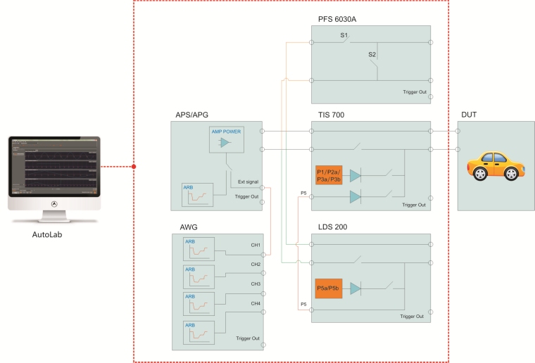 APS xxxxDSR系列配置了四象限双极性放大器,模拟线束上各种电压变化现象,能够产生电压跌落、短时中断等各种电压变化,输出内阻可以调节。内置信号源,用户可通过PC软件编辑输出任意波。也可作为电池供电模拟和直流电压源使用。在实验室测试时,APS xxxxDSR替换车辆蓄电池,产生Pulse 2b、Pulse 4、正弦波噪声和其它复杂电压变化波形。非常适合ISO 7637/16750传导瞬态测试。同时APS xxxxDSR系列符合众多国际/国家标准和汽车厂家标准要求。作为强大的直流电源,支持12V、24 V、42 V、24 V和48 V系统汽车测试。