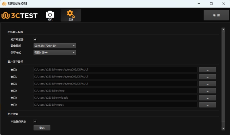 支持相机前景器设置、手动调节拍摄画质、自定义选择相片保存模式及路径和服务器连接状态测试。