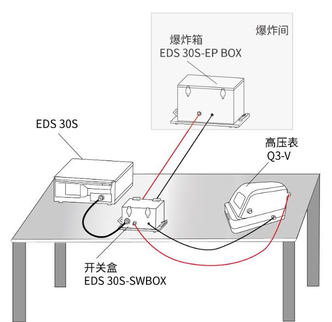 保险丝,电源线,扁平接地线,测试线,插头夹子,说明书,爆炸箱EDS 30S-EP BOX,开关盒EDS 30S-SWBOX,高压表Q3-V,电容模块500 pF、2 nF,电阻模块 500 Ω、5000 Ω、0Ω |