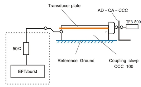 容性耦合板的校准是在EFT/Burst发生器(50ohm输出,2000V)上通过设置开路电压完成的。50Ω衰减器TFB 500的输出电压结果为1000V。
