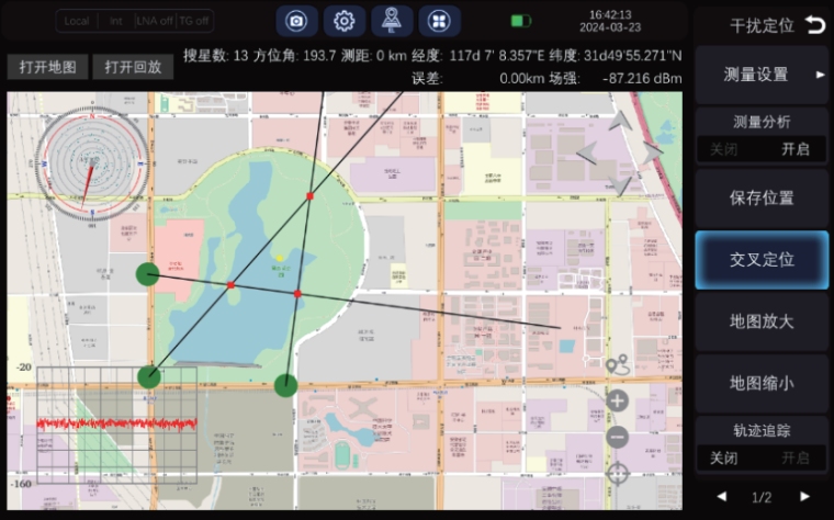 √.使用三角测量法,使用带GPS/BD和电子罗盘的定向天线,结合仪器内嵌的街道地图,捕获并确定干扰信号,有助于电信运营商或者管理 机构检测和测量干扰信号,并定位干扰源。