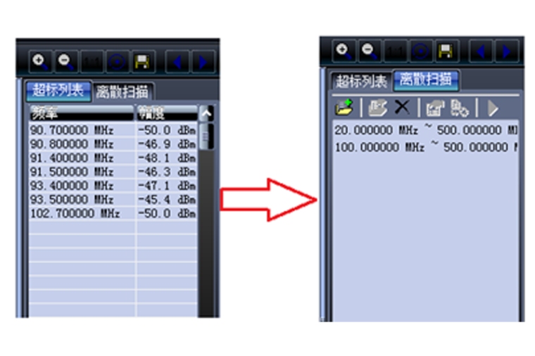 离散扫描 可以针对每一个离散频段进行特别设置, 包括起始、终止频率、步进/分辨率以及阈值, 为经常性的监视某些固定的离散频段的用户提供了方便。 | ![]() |