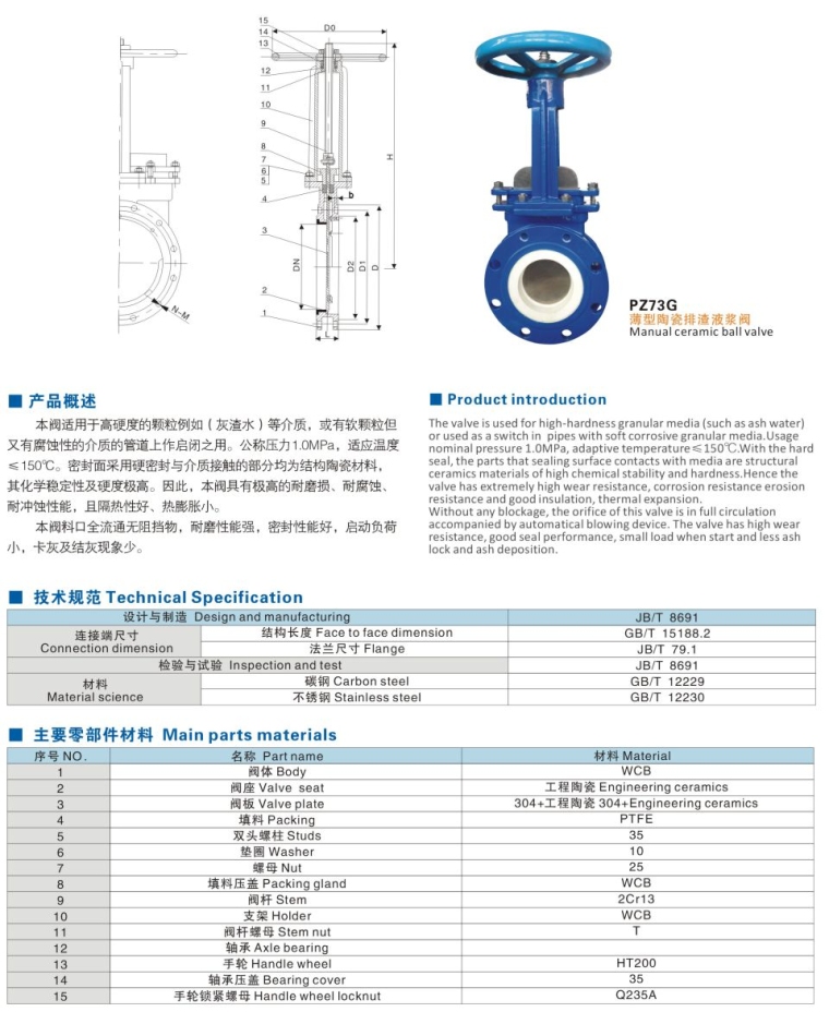 本阀适用于高硬度的颗粒例如(灰渣水)等介质,或有软颗粒但又有腐蚀性的介质的管道上作启闭之用。公称压力1.0MPa,适应温度≤150℃。密封面采用硬密封与介质接触的部分均为结构陶瓷材料,其化学稳定性及硬度极高。因此,本阀具有极高的耐磨损、耐腐蚀、耐冲蚀性能,且隔热性好、热膨胀小。