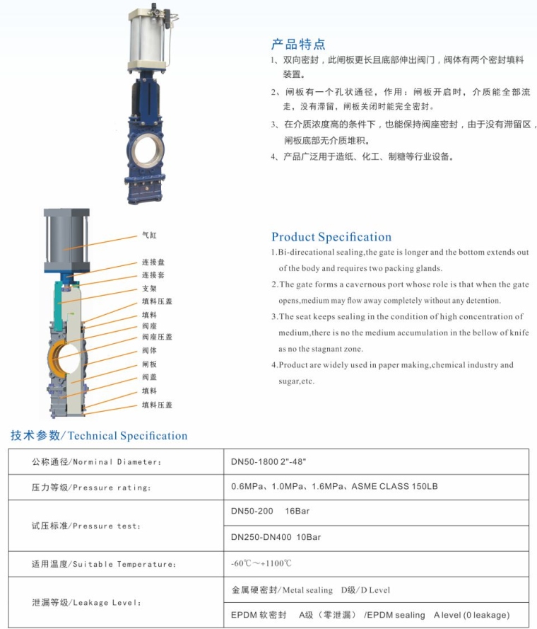 3、在介质浓度高的条件下,也能保持阀座密封,由于没有滞留区闸板底部无介质堆积。
