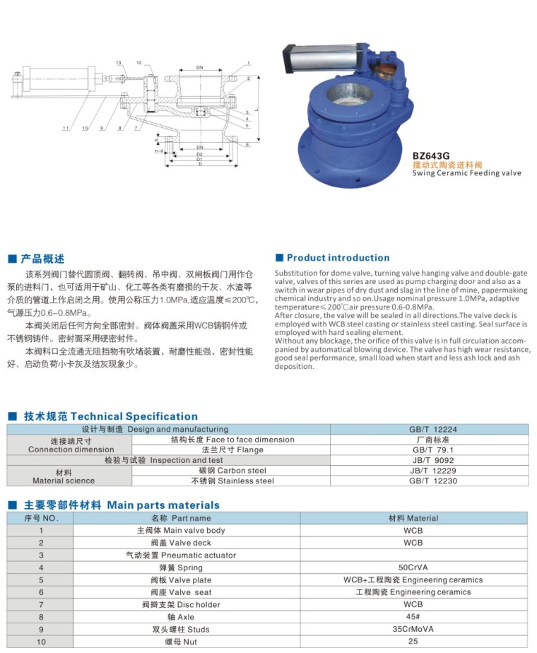 该系列阀门替代圆顶阀、翻转阀、吊中阀、双闸板阀门用作仓泵的进料门,也可适用于矿山、化工等各类有磨损的干灰、水渣等介质的管道上作启闭之用。使用公称压力1.0MPa,适应温度≤200℃,气源压力0.6-0.8MPa。