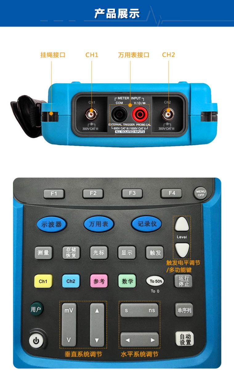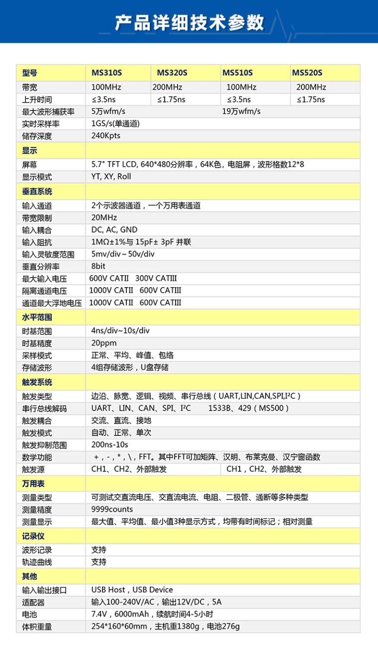 手持示波器MS510S 100MHZ,1GS/S,240Kpts,2-CH,19万次/s,隔离通道,7种总线