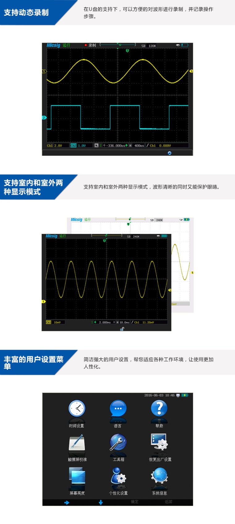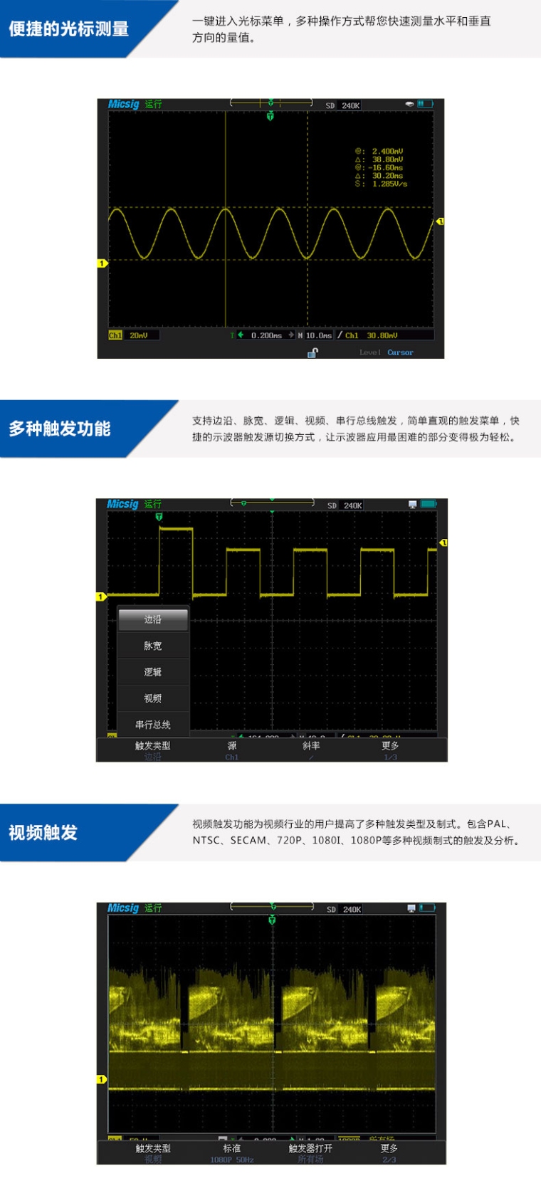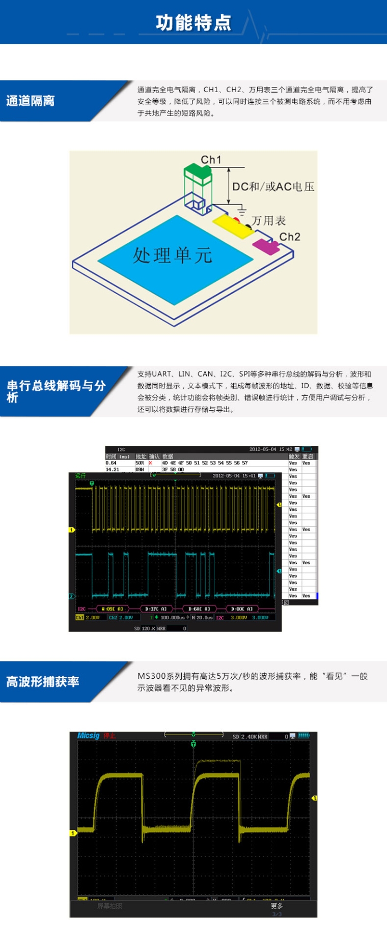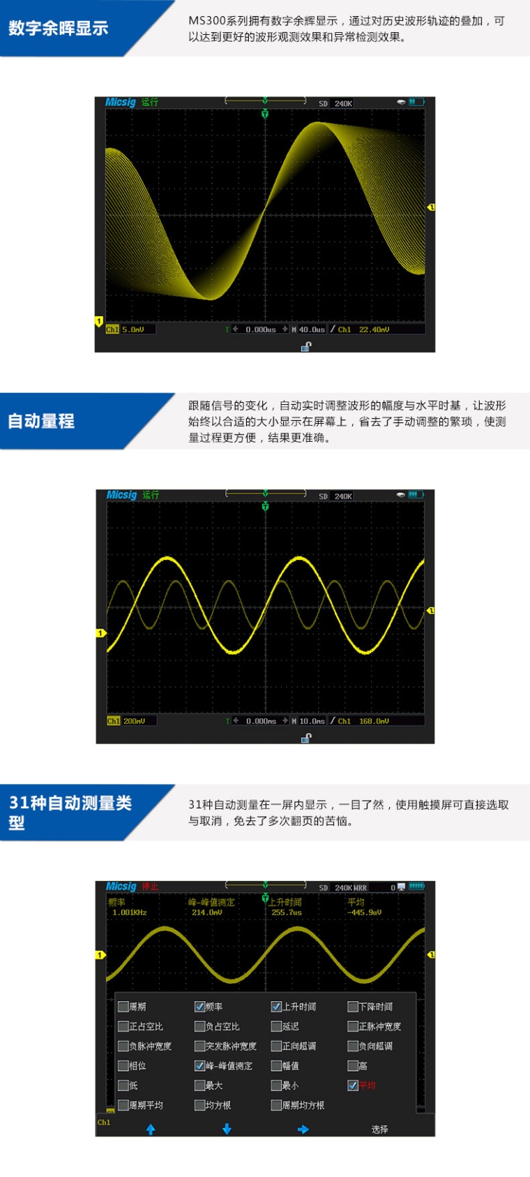 手持示波器MS310S 100MHZ,1GS/S,240Kpts,2-CH,5万次/s,隔离通道,5种总线触