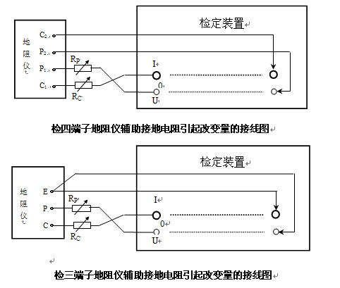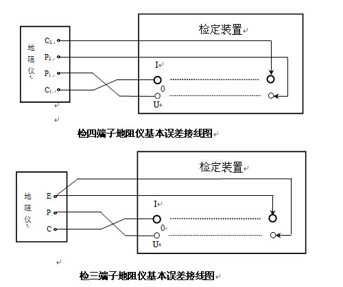 由于不同型号的接地导通电阻测试仪(工频接地电阻测试仪)输出的测试电流不同,测试范围也可能不一样,因而检定装置的电阻值和最大工作电流也应与之匹配。在检定基本误差时,将被检测试仪置于适当的量程,用截面积足够大的连接线将本检定装置与被检测试仪正确连接,如下图所示: