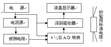 由高精度电流源产生一稳定的直流电流流经被测试品在试品两端产生的直流电压经处理后送至4 1/2 A/D转换器变成相对应数字量,该数字量再经过译码器转变成七段码,驱动液晶显示器显示相应的电阻值。