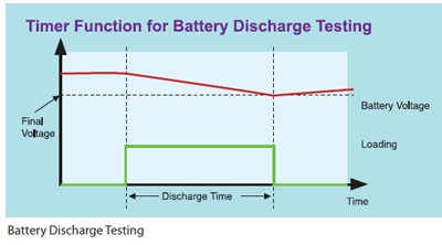 针对电池放电测试,63200A提供使用者三种放电模式 : 定电 流、定电阻与定功率模式,并透过设定截止电压与停止时间 (1秒~100,000秒),让电子负载能正确的停止拉载,确保电池 不会因过度放电而损坏。除此之外,在量测方面,能测量电 池的放电电量(WH、AH)与总放电时间。举例说明 : 当按下 Load ON开始拉载,63200A系列的内部计时器会开始进行计 数,直到电池电压降至所设定的截止电压或按下Load OFF停 止拉载,计时器才会停止计数。电池放电测试功能亦可应用 在超电容的放电时间测试和其他相同应用等。
