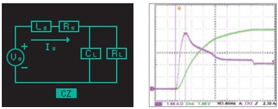 ****的定阻抗拉载模式不同于定电流及定功率的拉载方式, 定阻抗模式亦即模拟实际的感抗、阻抗、容抗与负载来进行拉 载,因此,拉载电流更能趋近真实情况。此波形图为模拟交换式 电源供应器于容性负载开机测试的电压、电流波形。