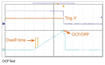 电源设计时,为确保使用者的安全及降低电源的损坏率,过电流保护或 过功率保护机制往往是需要被考虑与设计,63200A的过电流与过功率测 试,可提供使用者自行设定步阶电流或步阶功率来进行电源的过电流或 过功率保护测试,并于电子负载判定此测试结果为Pass或Fail,测试过程 中的大功率值(Pmax),亦能自动撷取并显示于显示器上,能帮助使用 者不透过示波器即可验证所设计的过电流与过功率机制是否正确,更可 为使用者减少许多测试时间。
