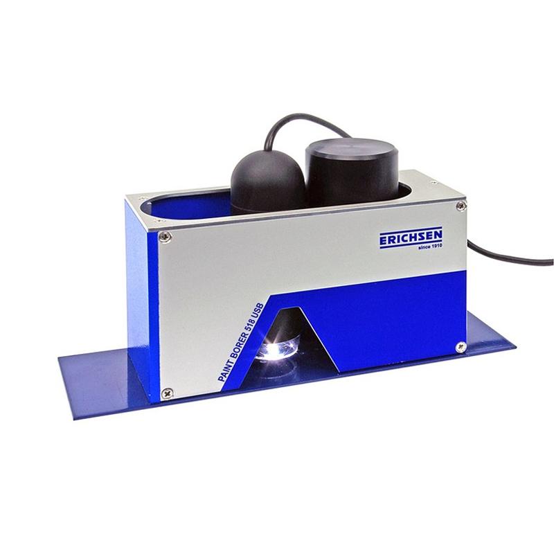 518USB根据标准的锲形切割原理进行测量。测量时试样以一定角度进行切割,然后用高分辨率数字显微镜(50倍放大率)内置8倍可调节白光源,和200万像素 CMOS图像传感器进行测量。可直接在试样上进行图像捕捉。新款518USB可连接电脑,将图像输入,电脑进行图像确认、感应、测量和记录随机提供相应测量软件.