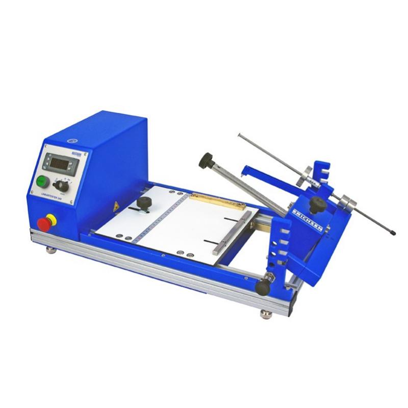 进行划痕测试时,测试工具放到试样上,然后试样向前移动,开始划痕测试。当滑板及试样回头移动时,导向板会将测试工具提起,试样可以侧向移动,这样可以在不同的压力下进行一系列划痕。滑板上装有一把尺,这样可以很容易地均匀设置划痕间的距离。当在导电基材上测试绝缘涂层时,划破涂层时可以电流感应,确保设置安全的划痕压力。对于耐磨擦测试、色牢度测试、MEK或耐磨洗测试时,测试工具压到试样上,试样往复运动,运动次数预先设置,测试过程中导向板需要从滑板上取下。有三种固定速度及一种可自由设置的速度可选。