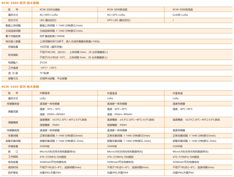 RCW-3000 分体联网监测系统采用 LoRa 、 4G 、 WiFi 、以太网等多种通讯传输技术,由无线采集器、 网关 、云平台、手机 APP 等 组成 。 无线 采集器 可 根据监测位置 需求任意部署网关可通过 4 G W i F i 以太网等方式上传数据,配合云平台和APP 可实现远程数据查看、历史数据查询、远程报警推送等功能 。 RCW-3000 分体联网监测系统广泛应用于大型冷库、阴凉库、医院 、 生鲜超市等场景。