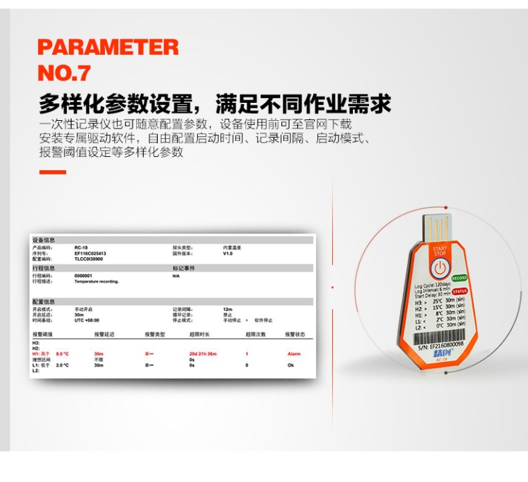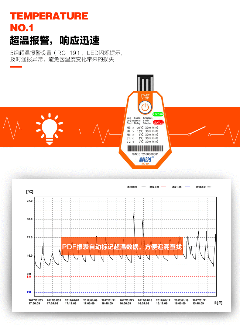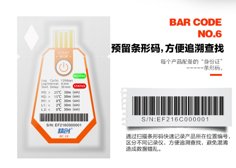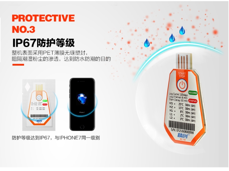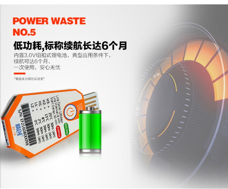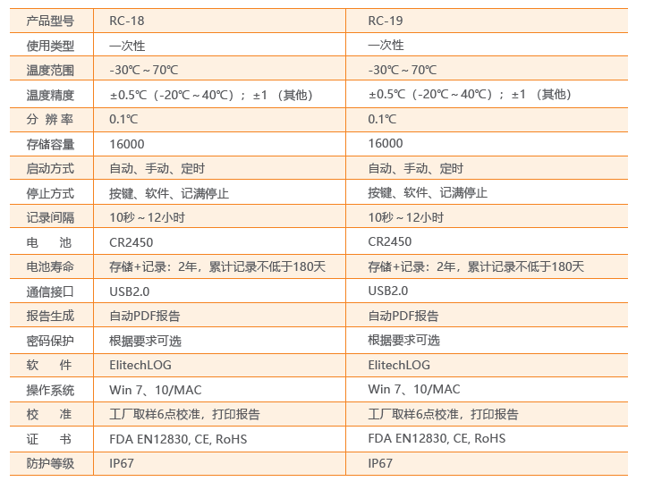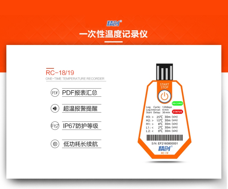 RC-18/19 温度记录仪主要用于食品及药品储运环境的温度监测记录,通过USB 的方式连接电脑,记录数据直接以PDF 报告输出;温度探头内置,采用CR2450 宽温锂电池供电,防水等级达到IP67。产品配有条形码。.