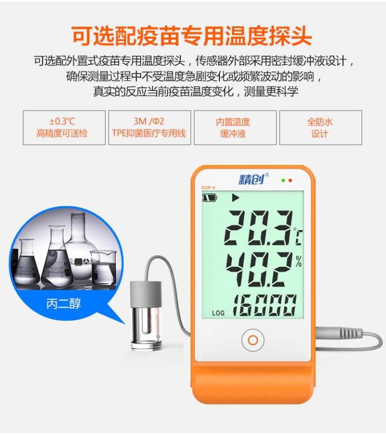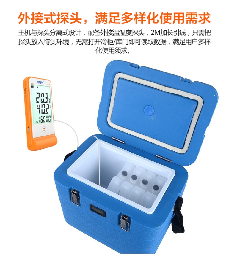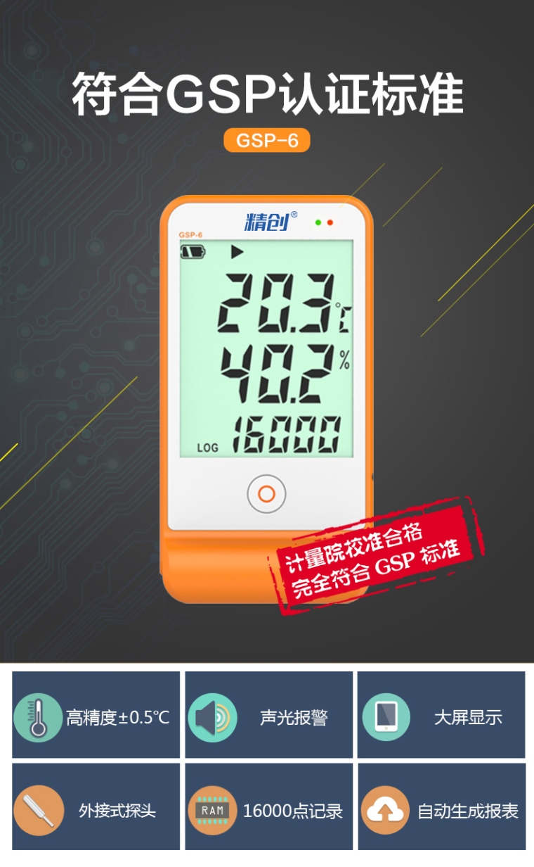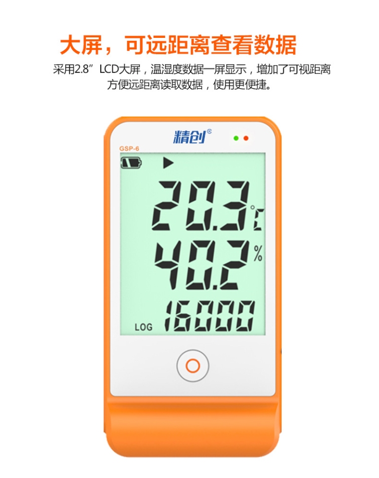 该记录仪主要用于监测记录食品、药品、化学用品等产品在存储和运输过程中的温湿度数据,广泛应用于仓储、物流冷链的各个环节。该记录仪符合新版GSP 要求,LCD 大屏显示,超限声光报警,单按键操作,内置温度传感器、外置温湿度传感器,支持记满停止和循环覆盖两种存储方式,可设置超限自动缩短记录间隔功能。