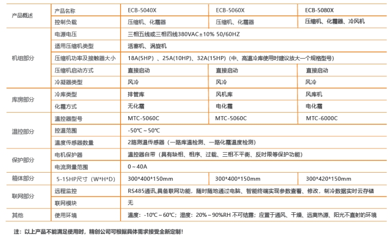 ECB-5060X系列电控箱是我司专为中低温冷库研发,双温度显示,按键直接进入查看、设置参数,多指示灯显示系统运行状态,集温度显示,电流显示于一体,具有温度测量、显示、控制;温度校正;温度超温、超量程及传感器故障报警等。