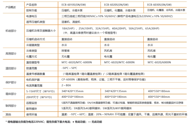 采用精易系列温度控制器,带远程监控功能的一款产品。双温度显示,按键直接进入查看、设置参数,多指示灯显示系统运行状态,可直观查看当前库温和设置温度,无需说明书即可操作;其中SN系列产品联网模块为4G模块,SW系列产品联网模块为WIFI模块,具备物联网功能。