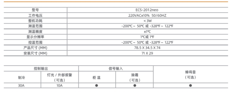 ● 可配置两路温度传感器用于柜温调节和除霜控制;