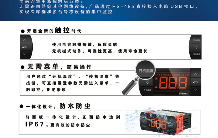 ◆简易的集中监控解决方案:无需路由器等其他网络设备,产品通过RS-485直接接入电脑USB接口,实现冷库群和多台冷冻设备的集中监控;