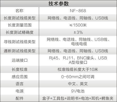 2.可测试网络线、电话线、同轴线、USB线的长度和断点。