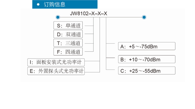 JW8102 高速光功率计提供优越的动态范围和线性度技术指标,该功率计采用RS232-C和RS485通讯接口,可直接与PC机进行通讯,通信协议采用精简指令与标准指令兼容的方式,精简指令可大幅提高与PC的通信速率,标准指令可大大提高与PCB通信的可靠性。