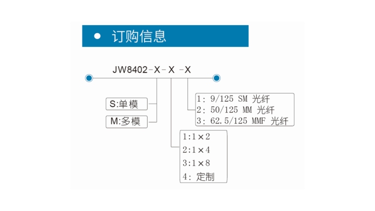 JW8402机架式光开关主要用于光交换设备及系统中实现全光层次的路由选择、波长选择及自愈保护功能。该产品可根据客户需求,配置为1×2、1×4、1×8通道及其它定制通道数。