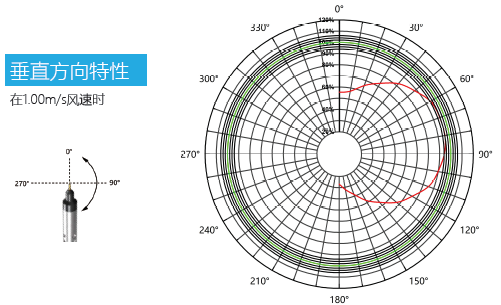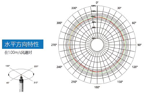 JT1406风速传感器探头为全向响应,这一性能对未知风向或不稳定风向、随机风向的风速测量尤为重要,JT1406在水平方向拥有优秀的方向响应特性,在不同角度(风向垂直于探头指向)的来风方向都能保持快速响应和精确测量。