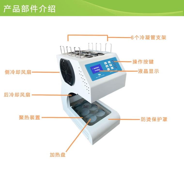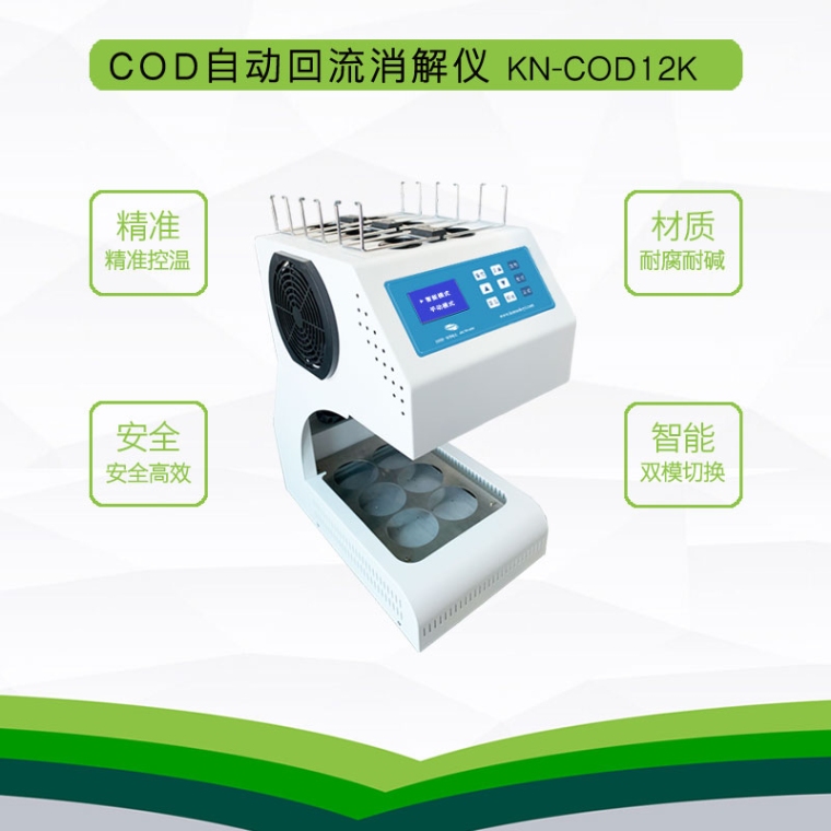 此款仪器采用COD回流消解方式,水样反应完全。消解过程中采用风冷却回流模式代替水冷却回流模式,节约水资源。冷却时,增加风冷却系统,节约检测时间。依据国标方法HJ_828-2017化学需氧量的测定(重铬酸钾法)设计,在手动操作模式之外添加智能模式,一键操作,完成消解、冷却过程。配备专用冷凝管支架,操作安全。
