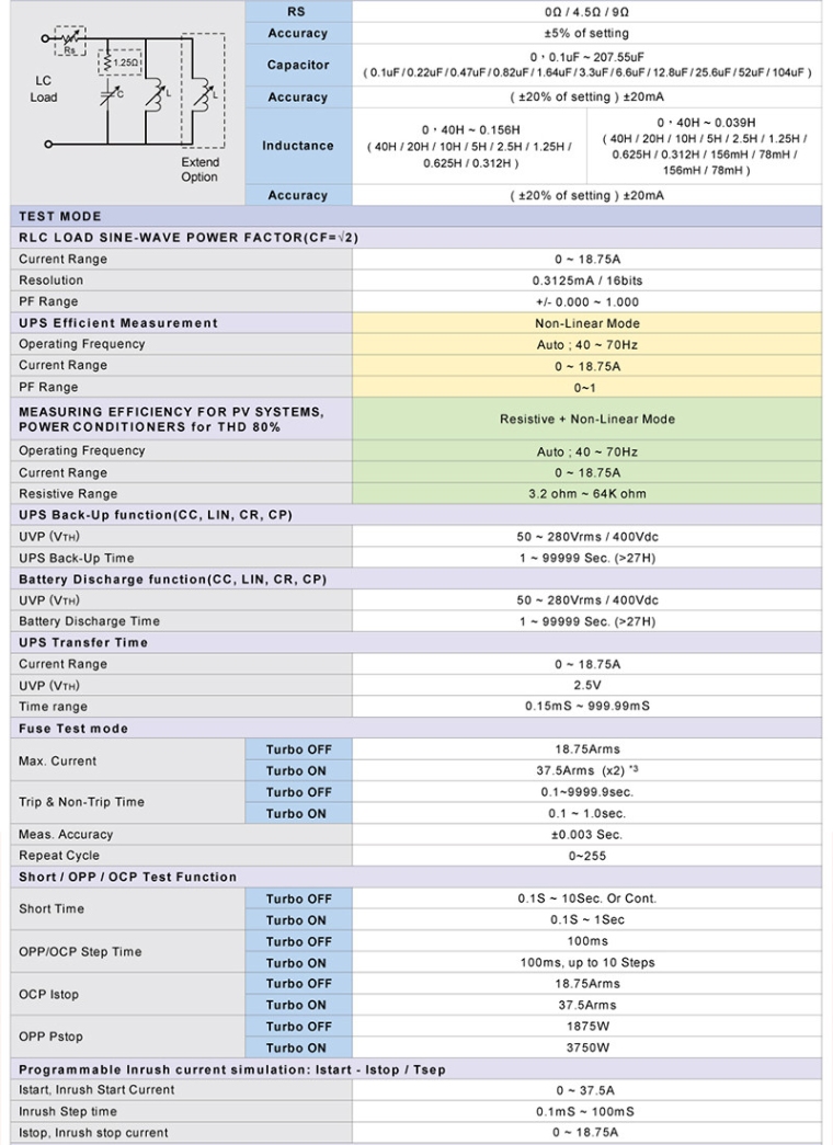 內建測試模式包括UPS Efficiency、PV Inverter Efficiency、UPS Back-up time、Battery Discharge time、UPS transfer time、Fuse/Breaker Trip/Non-Trip、短路模擬、OCP、 OPP、PF、INRUS(Inrush)、SURGE 等測試模式。
