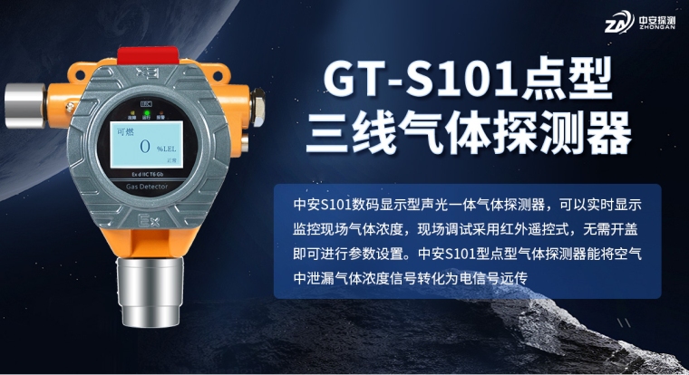 S101型点型气体探测器能将空气中泄漏气体浓度信号转化为电信号远传,仪表采用三线制4~20mA方式,可直接上传DCS或PLC等设备,也可独立使用,具有两组无源开关量输出可现场控制其它设备,仪器具有传输距离远、抗干扰等优点。