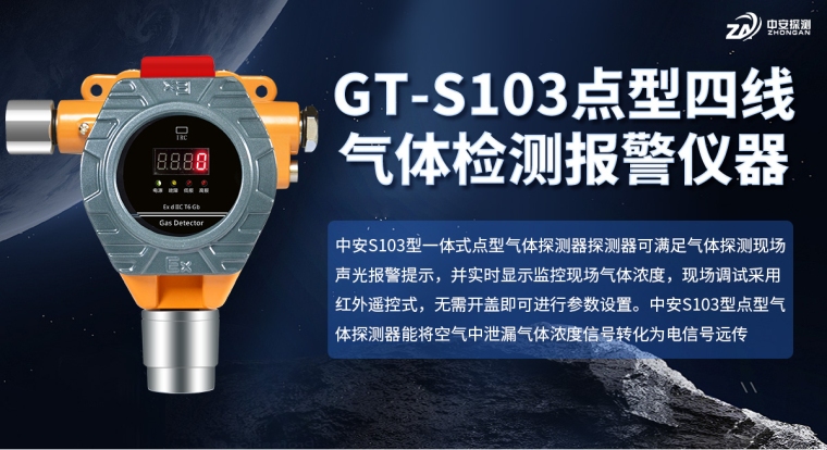 中安S103型点型气体探测器能将空气中泄漏气体浓度信号转化为电信号远传,仪表采用四总线的数字输出方式,具有传输距离远、抗干扰等优点。仪表定制无线传输,可独立使用,具有无源出点输出或开关量输出等功能。