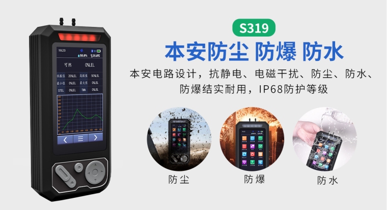 中安探测S319防爆型8合一气体检测报警器,可自由定制8种可燃气体或有毒有害气体传感器进行检测,防护等级IP68