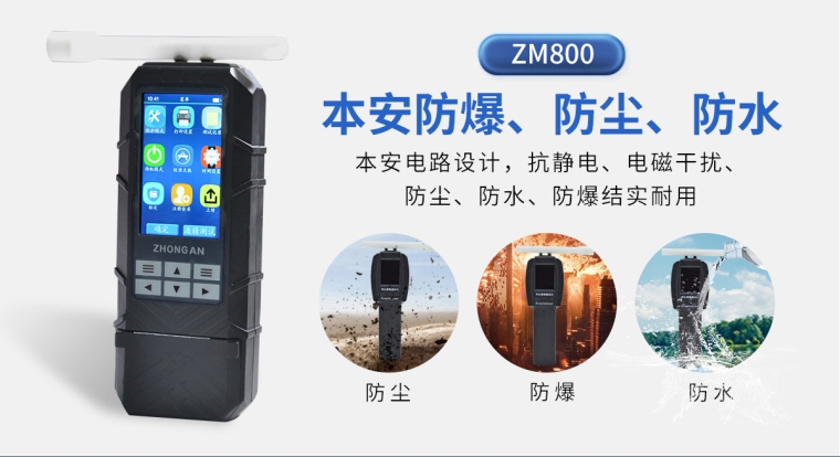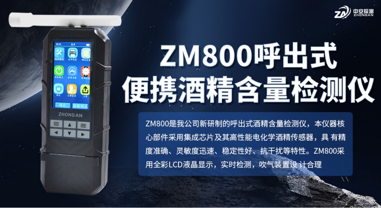 ZM800是我公司新研制的呼出式酒精含量检测仪。本仪器核心部件采用高科技电化学酒精传感器,具有高精度、高灵敏度、高稳定、强抗干扰能力的特性且方便校准等优点;