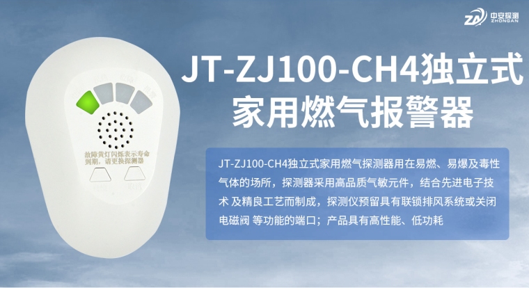 JT-ZJ100-CH4独立式家用燃气探测器用在易燃、易爆及毒性气体的场所,探测器采用高品质气敏元件,结合先进电子技术及精良工艺而制成,探测仪预留具有联锁排风系统或关闭电磁阀等功能的端口;产品具有高性能、低功耗、操作简单、便于维护等优点,广泛应用于家庭、宾馆、公寓等场所。