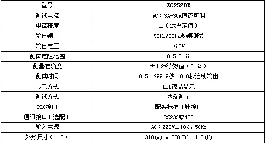 名称:ZC2520X型程控接地电阻测试仪 型号:ZC2520X 简介:本仪器符合GB4706.1标准要求,适用于灯具、信息技术设备、家用电器等产品的接地电阻测试。线性恒流输出,标配PLC接口,可现配RS232或485 1、符合《GB4706》《IEC60335》家用和类似用途电器的安全性能检测原理通用要求 2、符合《GB7000》《IEC60598》灯具一般安全要求与试验 3、符合《GB4943》《IEC60950》信息技术设备安全 4、符合《GB12113》《IEC60990》接触电流和保护导体电流的量测方法 5、无触点升流,50/60Hz双频输出,满足国内、出口产品的测试要求 6、 无升流器恒流输出,噪音小,故障率低 7、LPA(线性)技术国内,输出波形纯净,绿色环保,符合IEC、UL等电气安全规定 8、2%测试精度国内 9、可选配RS-232、RS-485、遥控等接口,实现测试网络化