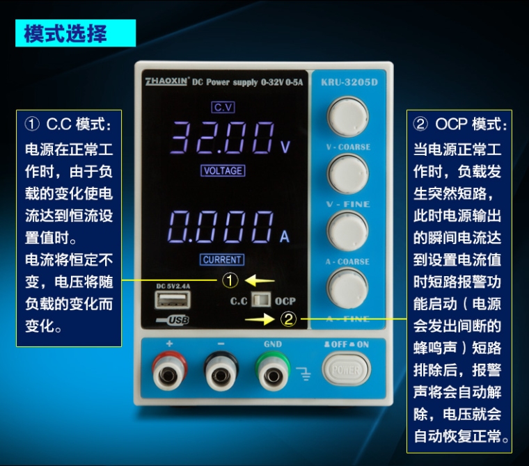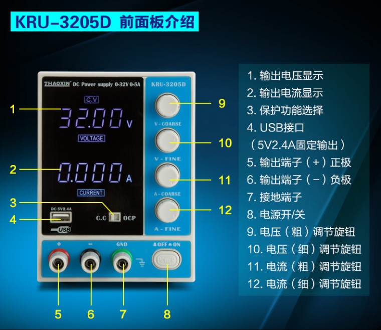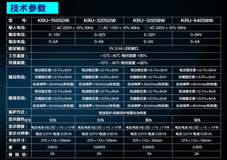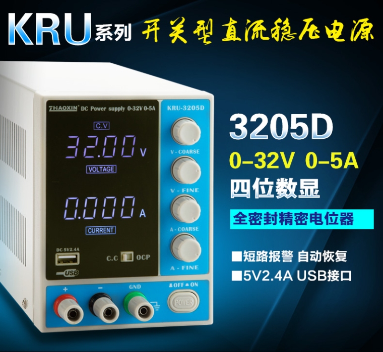 KRU-3205D笔记本维修电源直流可调32V5A开关型足功率稳压恒流源