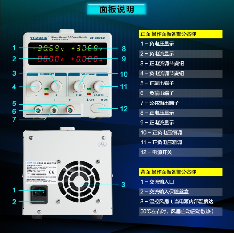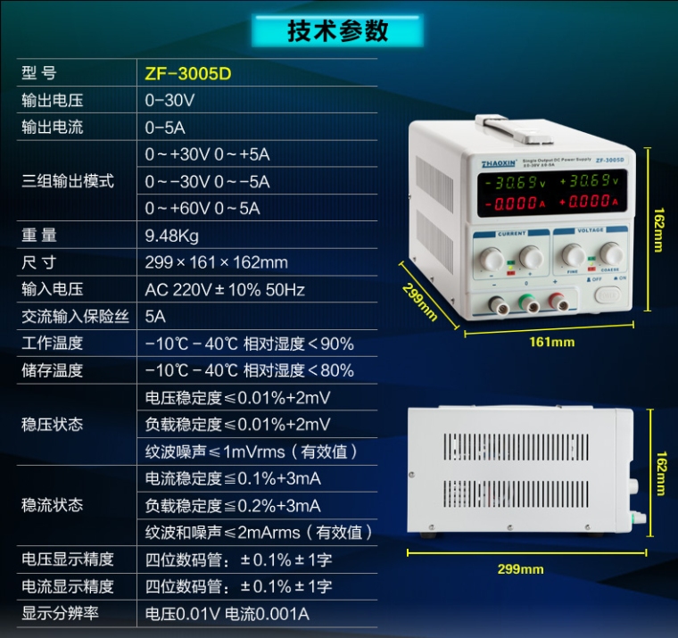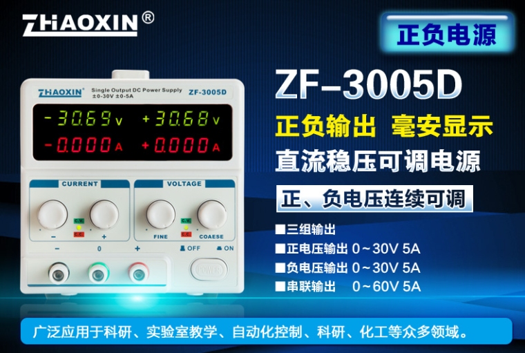 ZF-3005D双路可调直流稳压电源正负30V5A电压同步实验开发维修可调电源(正负输出毫安显示)