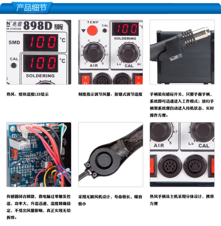 898D无刷风机柔和风SMD热风拔焊台700W