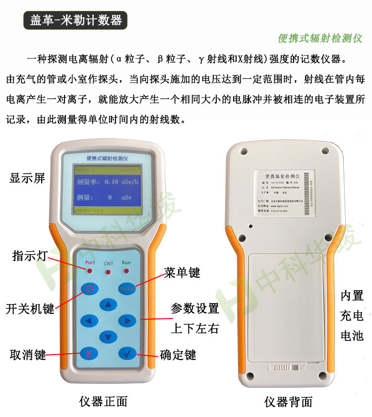 HJ-R-EGD辐射检测仪采用补偿型GM计数管作为探测器,可测量γ射线与X射线;以彩色液晶屏为显示器件,使操作更为简便与人性;具有剂量率和累积剂量双阈值报警功能,在测量范围内,报警阈值可任意设置,可自动记录报警事件,并可手动查看报警记录。
