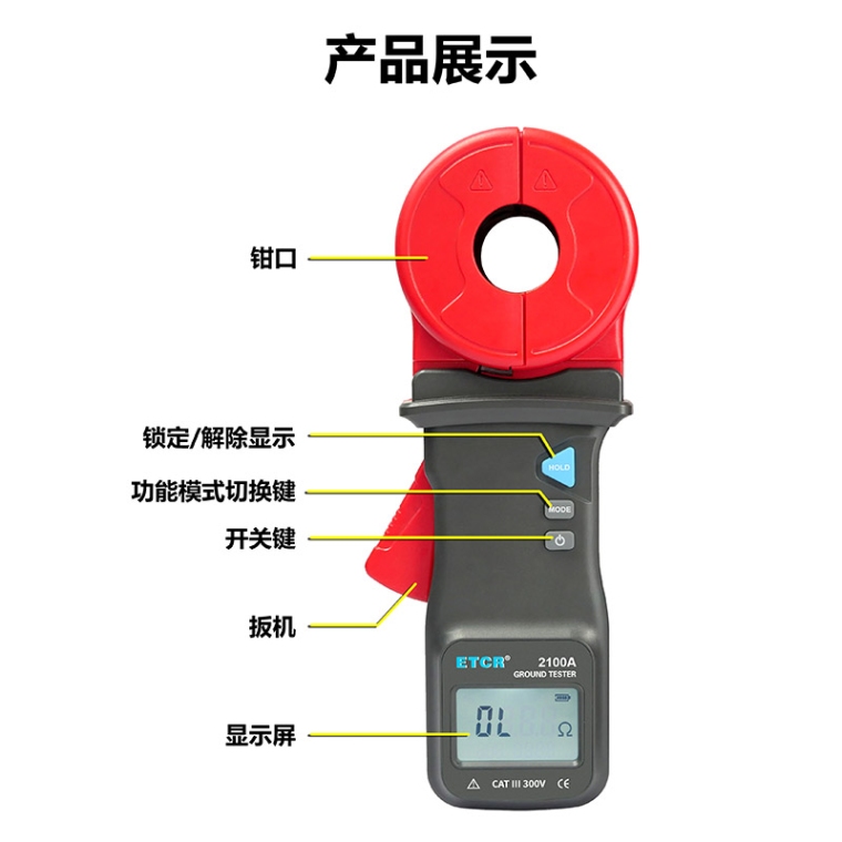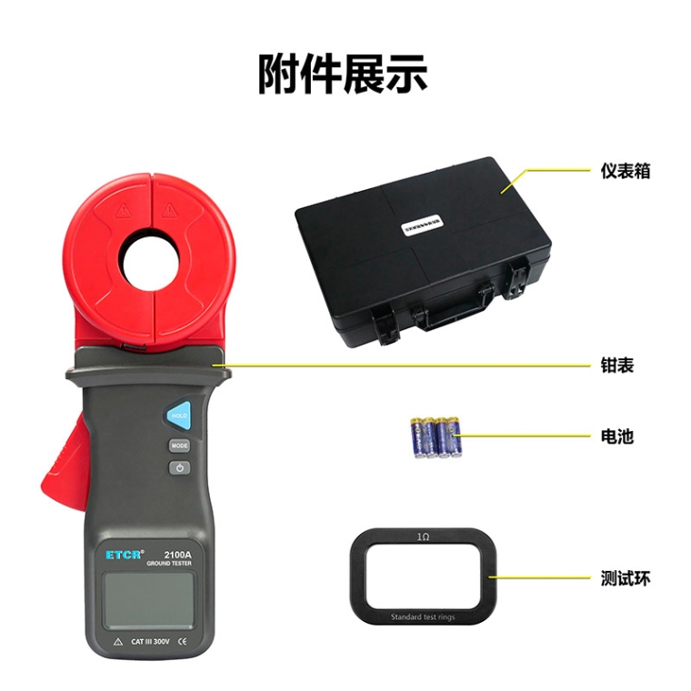 ETCR2100A钳形接地电阻仪是传统接地电阻测量技术的重大突破,广泛应用于电力、电信、气象、油田、建筑及工业电气设备的接地电阻测量。ETCR系列钳形接地电阻仪在测量有回路的接地系统时,不需断开接地引下线,不需辅助接地极,**快速、使用简便。