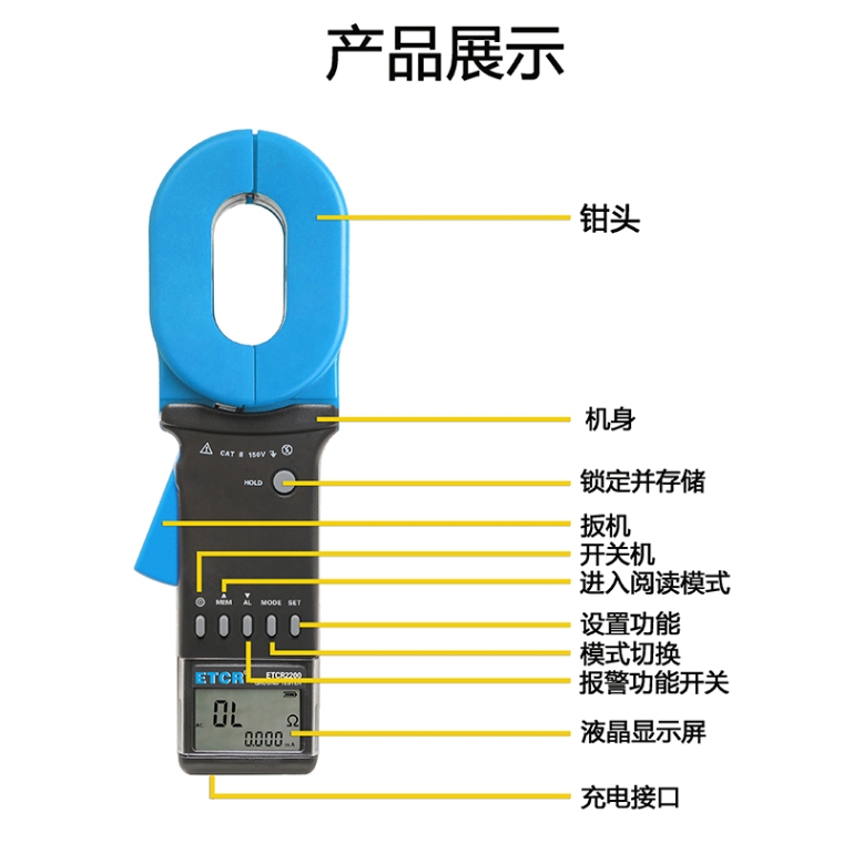 1.产品功能 接地电阻测量、回路电阻测量、接地电压测量、接地引下线漏电流测量,判断接地故障。 2.产品特点 1. 接地电阻测试技术的重大突破、非接触式测量安荃快速。在测量有回路的接地系统时,不需断开接地引下线,不需辅助接地极,省时省力。 2. 电阻、电流同屏显示,测试结果一目了然。 3. 声光报警功能,数据存储、数据保持功能。时钟功能,显示当前测试时间。 4. 配备USB接口、通讯线及软件,存储数据可以上传电脑,便于读取、保存、打印等。 5. 配备可充电锂电池,使用方便。 6. 蓝牙功能,手机连接蓝牙后可通过手机蓝牙软件来查看测量的数据等。 |