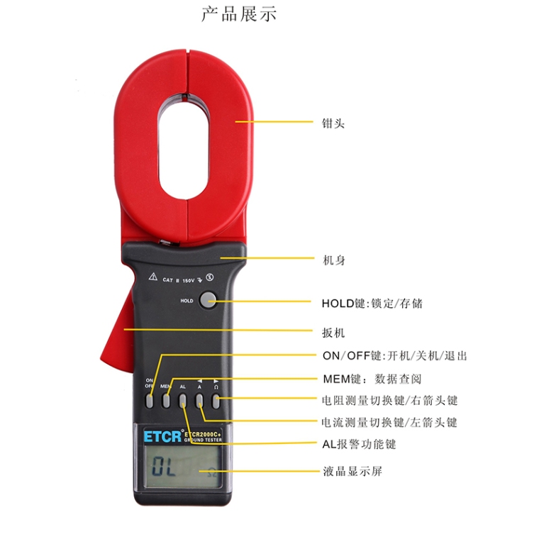 ETCR系列钳形接地电阻仪有长钳口及圆钳口之分。长钳口特别适宜于扁钢接地的场合。C型钳形接地电阻仪还能测量接地系统的泄漏电流和中性线电流。