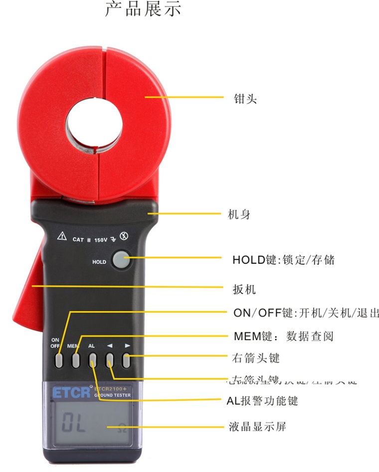 ETCR系列钳形接地电阻仪有长钳口及圆钳口之分。长钳口特别适宜于扁钢接地的场合。C型钳形接地电阻仪还能测量接地系统的泄漏电流和中性线电流。