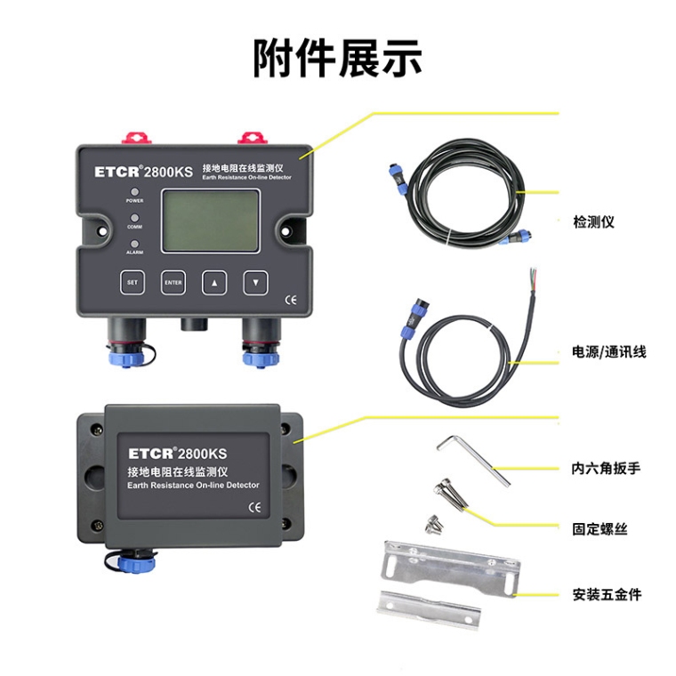 ETCR2800KS接地电阻在线检测仪用于在线监测接地电阻、接地引下线的连接状况、回路接地电阻、金属回路联结电阻,还可以在线监测接地电流。又称接地电阻在线测试仪、回路电阻在线监测仪。检测仪采用非接触测量技术、地线穿心通过传感器、绝不影响防雷接地效果和设施的正常运行;检测仪有多种结构适应不同场所使用;检测仪防护等级IP54,可在户外安装使用。检测仪广泛应用于输电线路杆塔接地;气象防雷接地;石油化工接地;通讯接地;变配电站接地;铁路设施接地;建筑仓库接地;金属回路阻值;电气设备接地等。