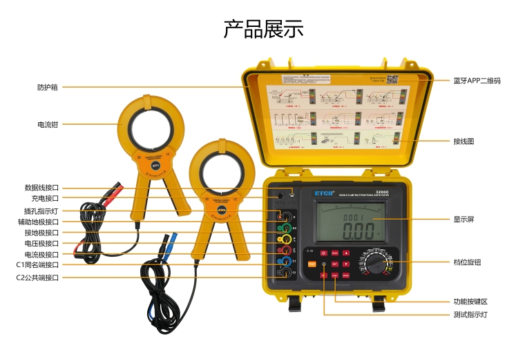 ETCR3200C双钳多功能接地电阻测试仪由主机、电流钳(双钳)、测试线、辅助接地棒、通讯软件、通讯线等组成。主机超大LCD显示,具有背光、棒图指示,一目了然。仪表具有存储功能,时钟功能,自动存储含有日期时间的测试结果2000组。仪表具有支持安卓系统的蓝牙通讯功能,安装APP后可在移动终端进行测试或读取测试记录,给你带来全新体验。仪表具有USB接口,存储数据通过USB接口上传PC机,通讯软件可以实现历史记录数据读取、查阅、保存、报表、打印等功能。仪表广泛应用于电力、电信、气象、油田、建筑、防雷及工业电气设备等行业。